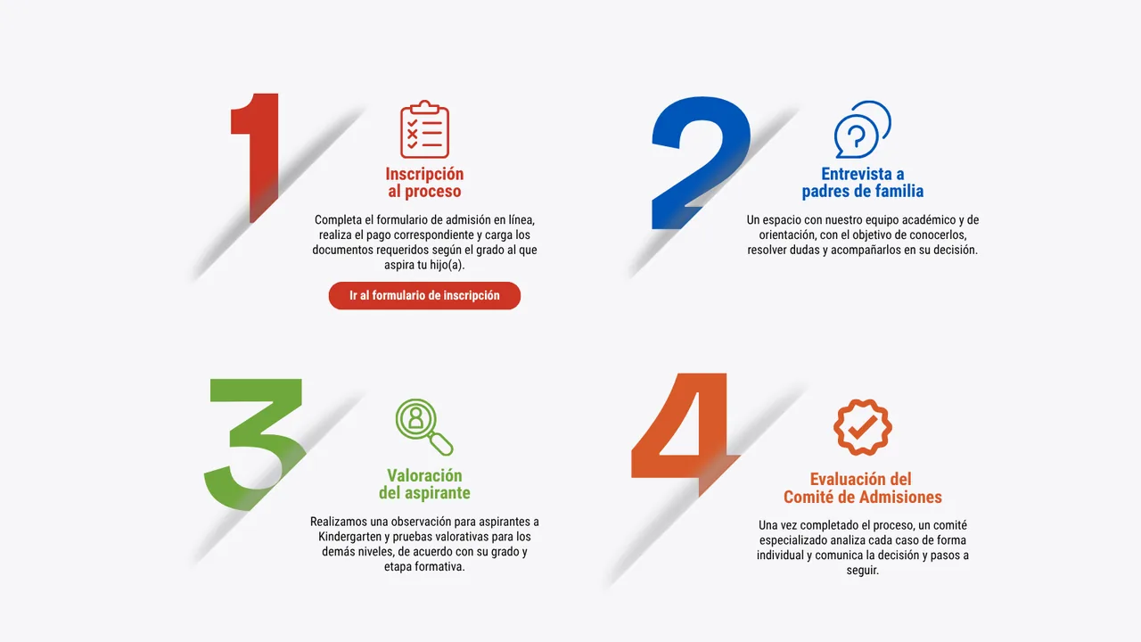 Completa el formulario de admisión en línea, realiza el pago correspondiente y carga los documentos requeridos según el grado al que aspira tu hijo(a).